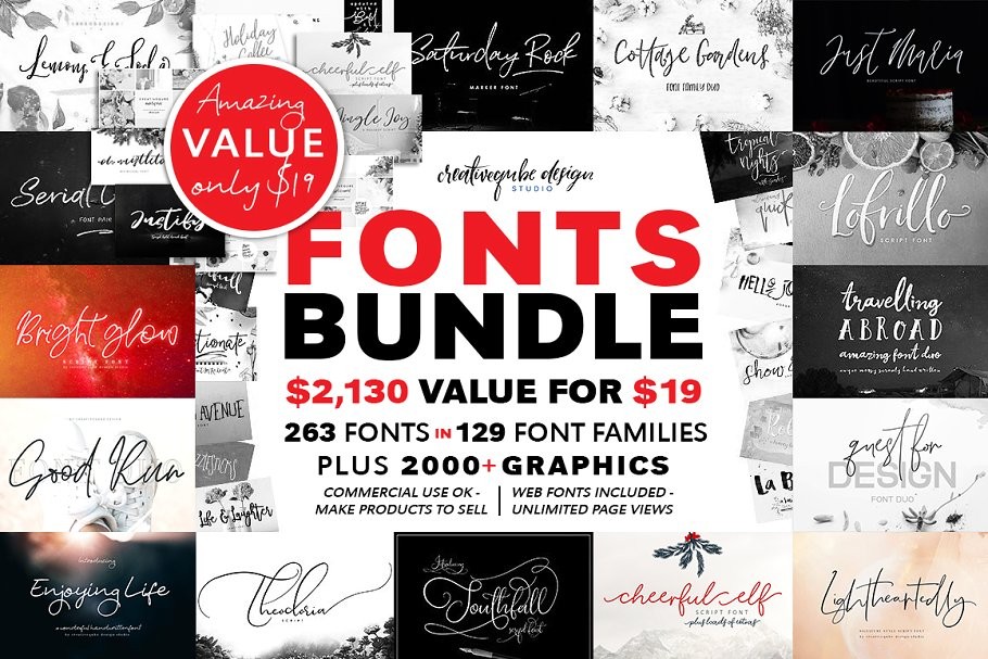 The value of this bundle is HUGE as it includes web font licenses with unlimited page views!! The web fonts (WOFF files) are included for most fonts. If they are not included you are permitted to convert the font to a web font to use.