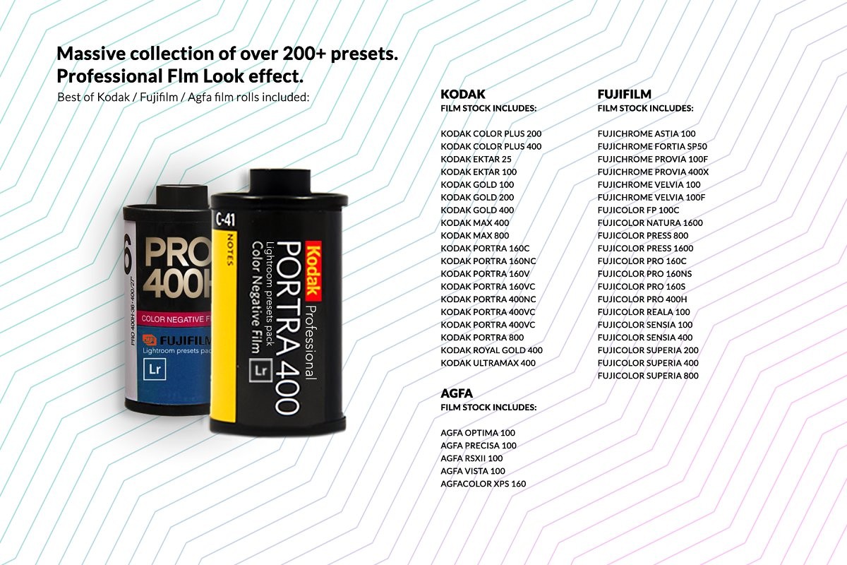 Complete Pack Collection of over 200+ presets. Get the best of KODAK, FUJIFILM, AGFA real film looks.
