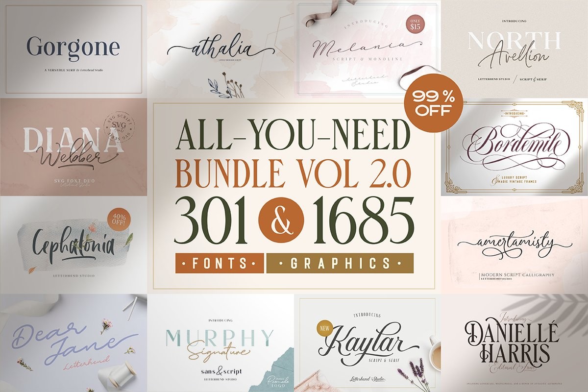 This bundle has wide range of typeface styles from modern calligraphy, monoline script, dry brush hand writing, grunge / rustic, elegant serif, clean sans serif, watercolor, cartoonish, horror, signature style, logotype font, etc etc.. you name it! The reason why this bundle is called all-you-need is because indeed it is literally all you need for to do various projects such as logo design, posters, headlines, wedding cards, invitations, packaging, apparel, etc with tons of features like ligatures, swash, alternates, multilingual and PUA encoded!