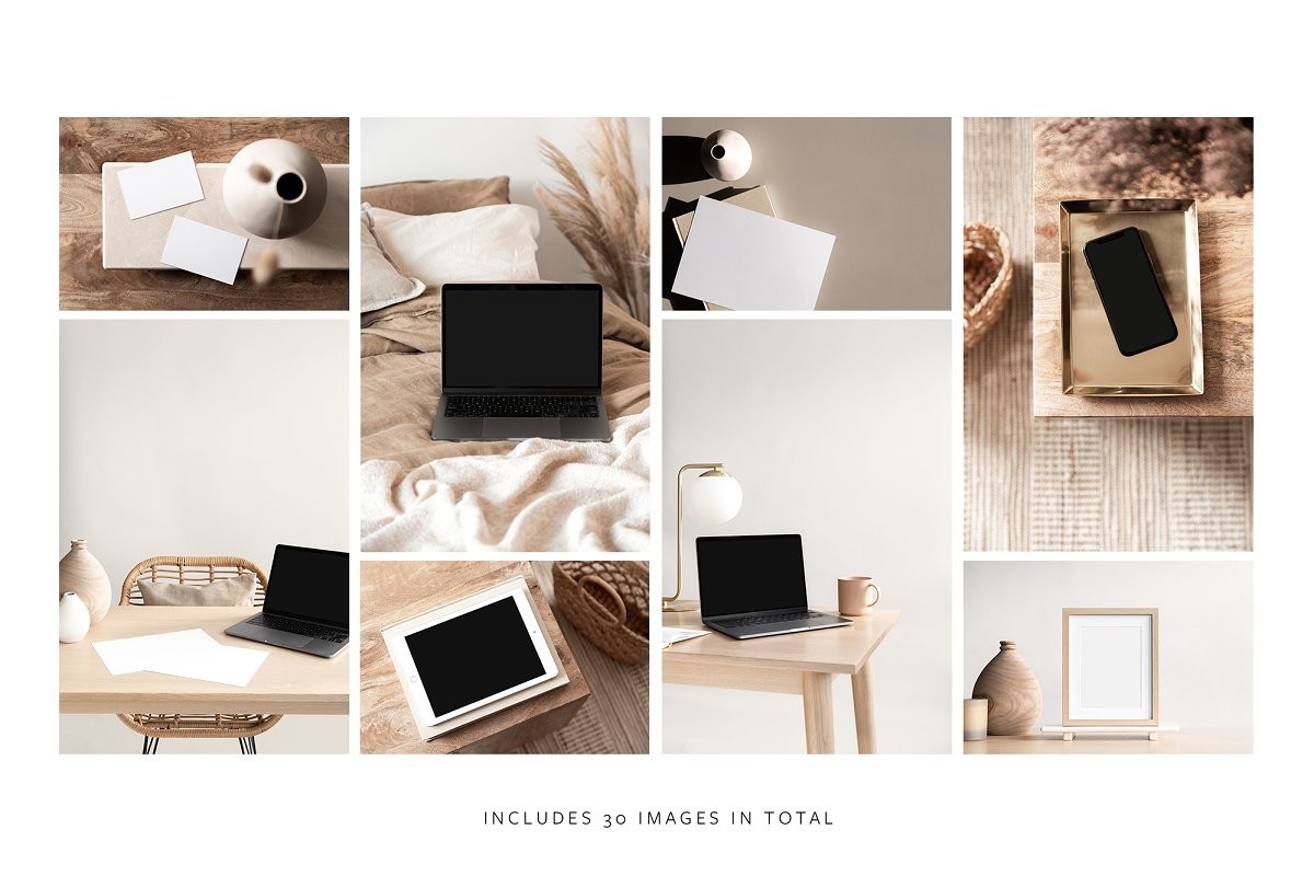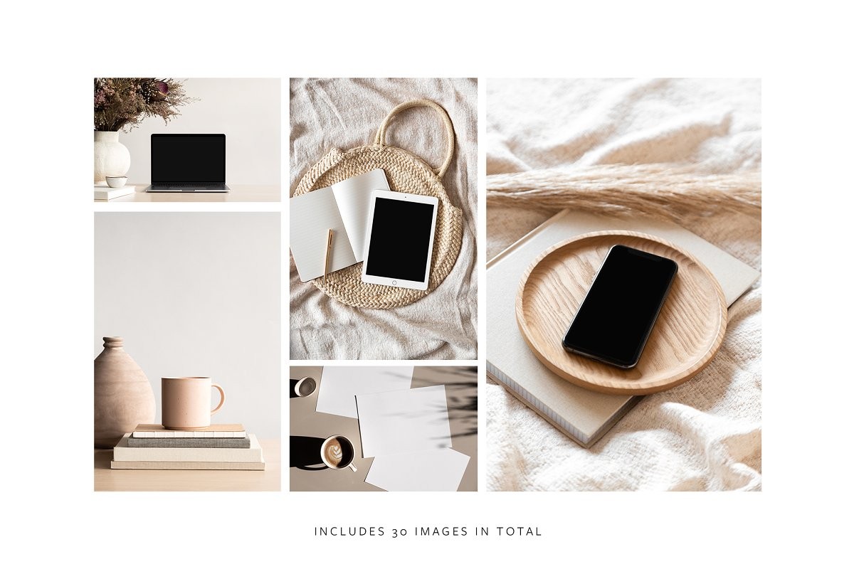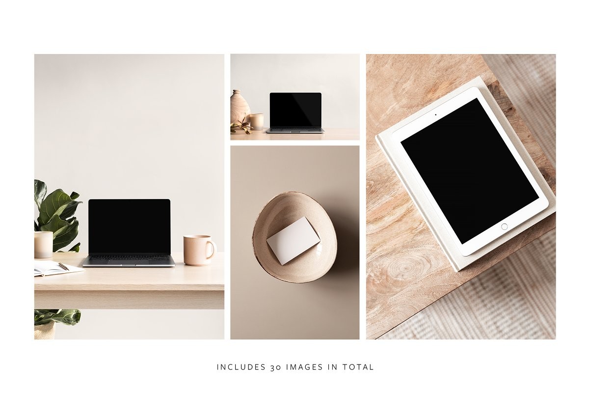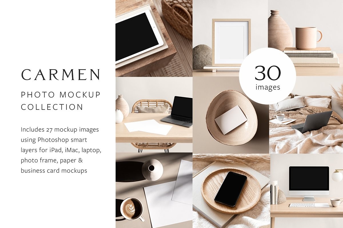 This collection includes 27 Photoshop mockup images for iPad, laptop, iMac, A4 paper, photo frames and business cards. These mockup images use Photoshop smart layers, so you can customise the images to reflect your brand and business.