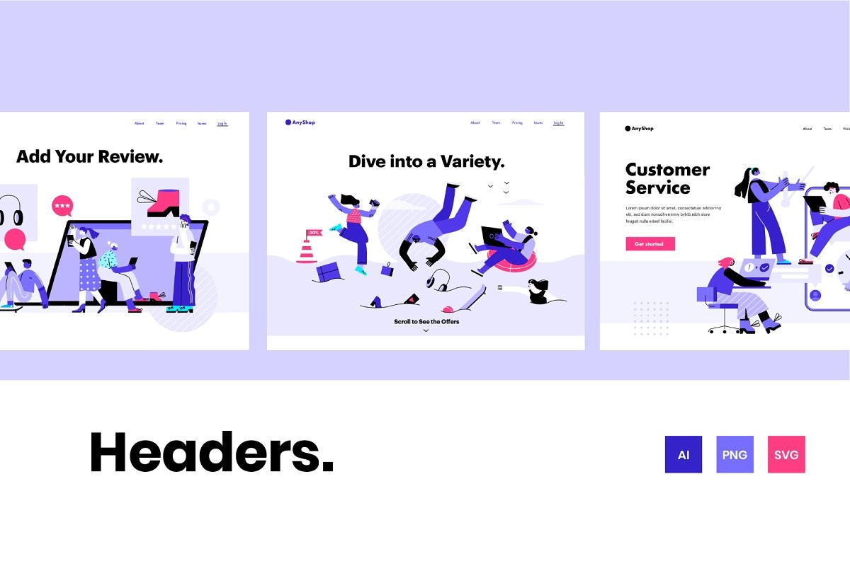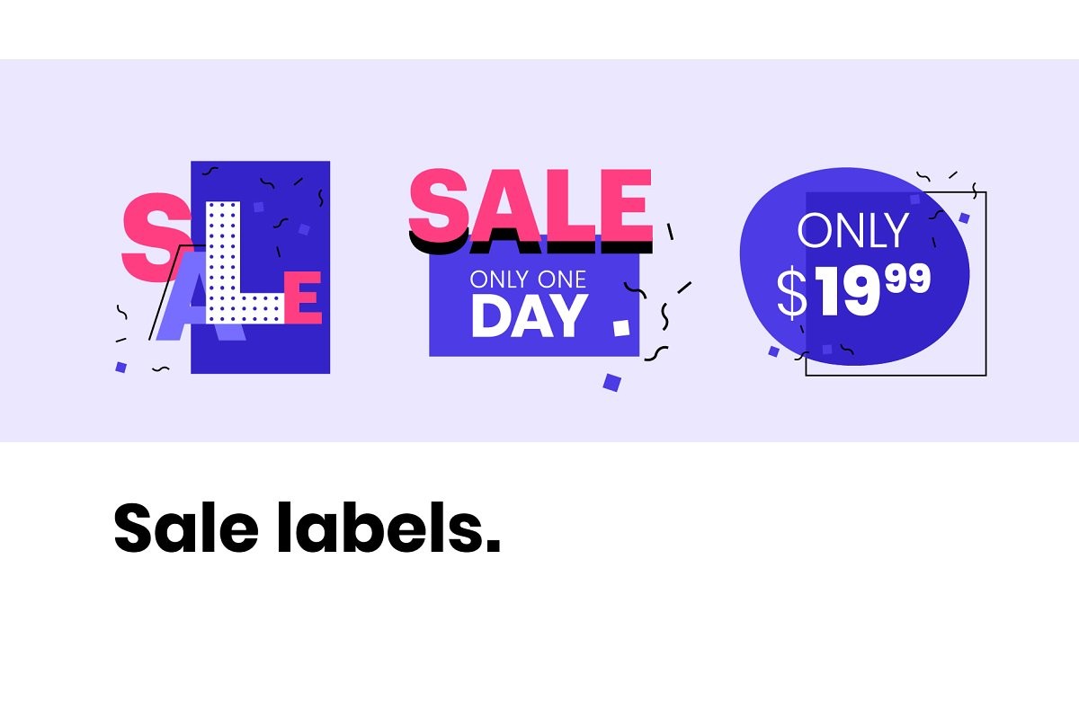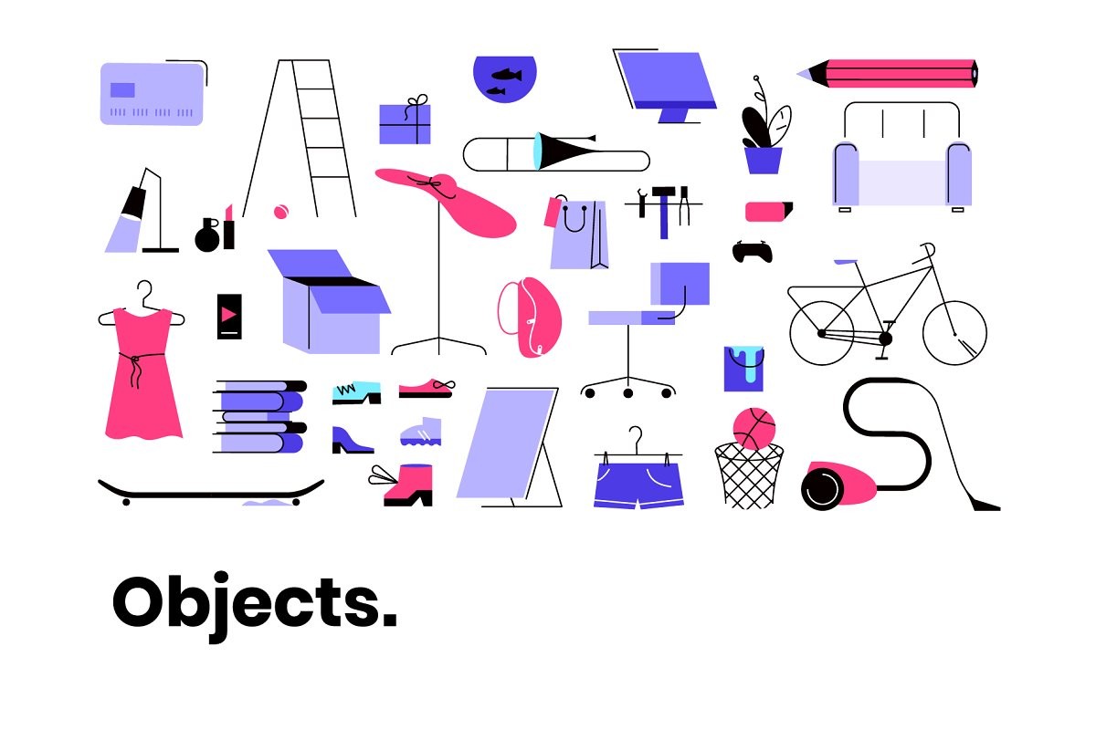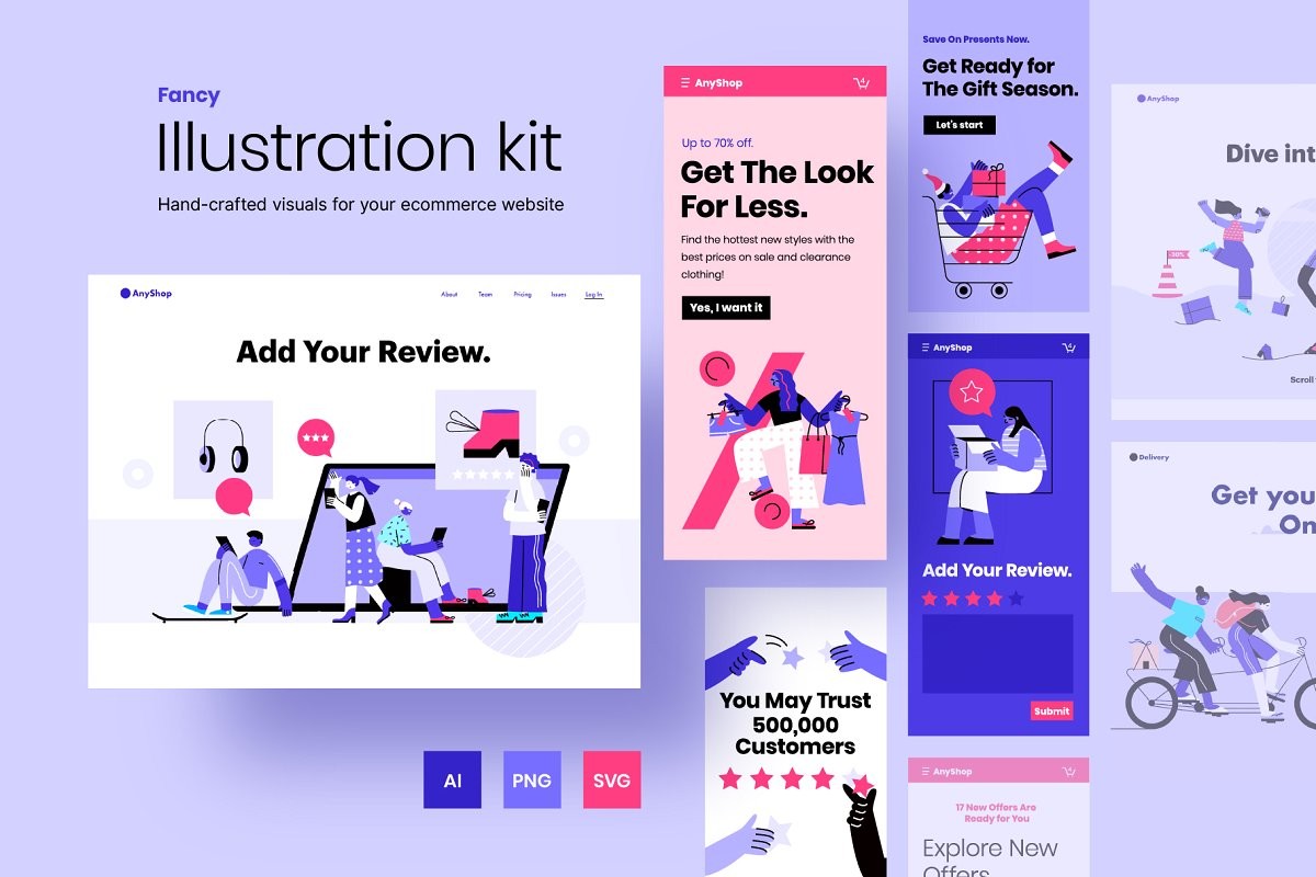 The “fancy” illustration kit is about e-commerce. The collection has a diversity of characters and objects, shapes, labels and UI-elements to interact with. The applications show how the illustrations may be used as hero images for a website, mobile screens, posters and more.