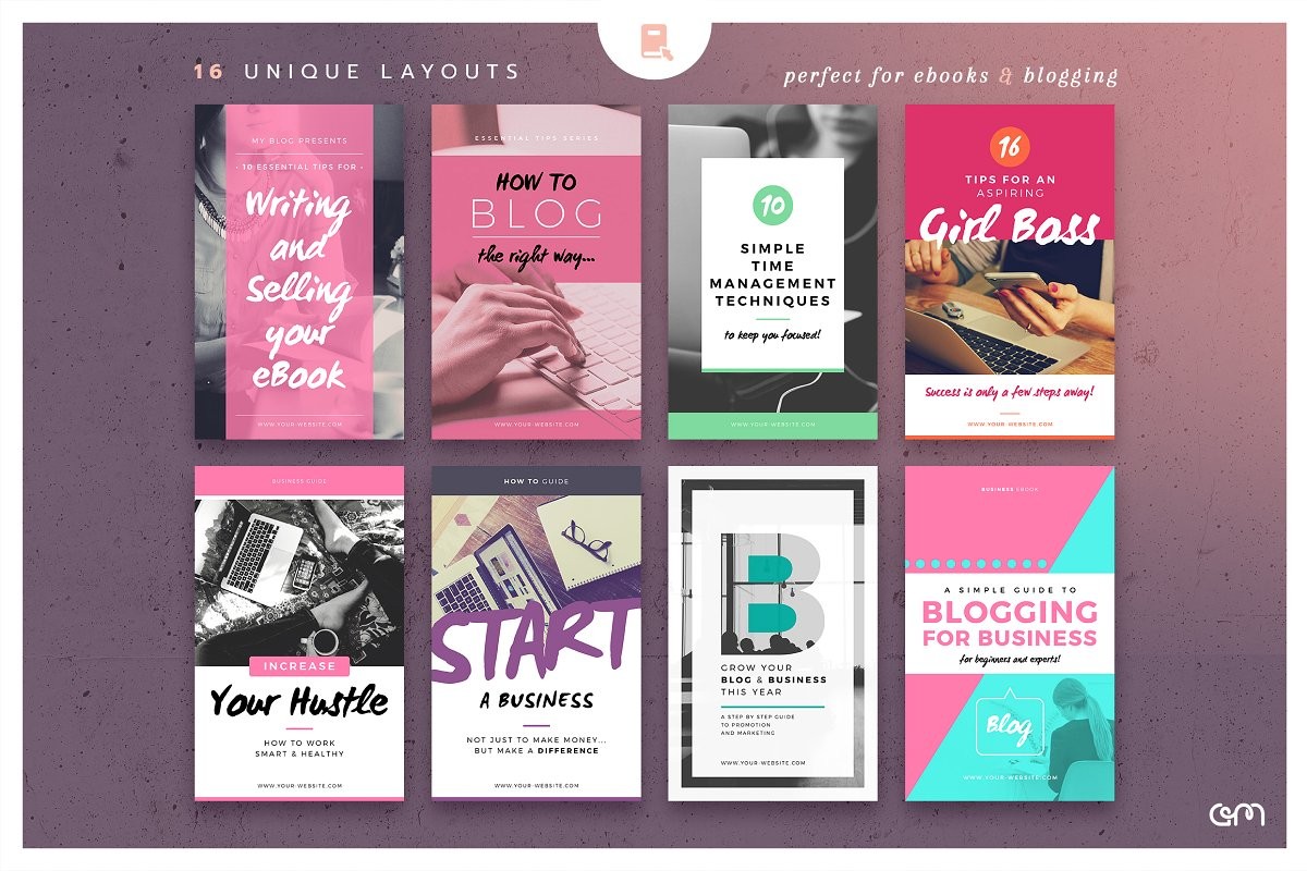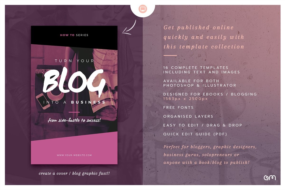 Inside you’ll find 16 easy to edit, fully customisable Ebook Cover / Blog Post templates, created in both Photoshop & Illustrator and optimised for use in downloadable Ebook format or high quality Blog Posts graphics.