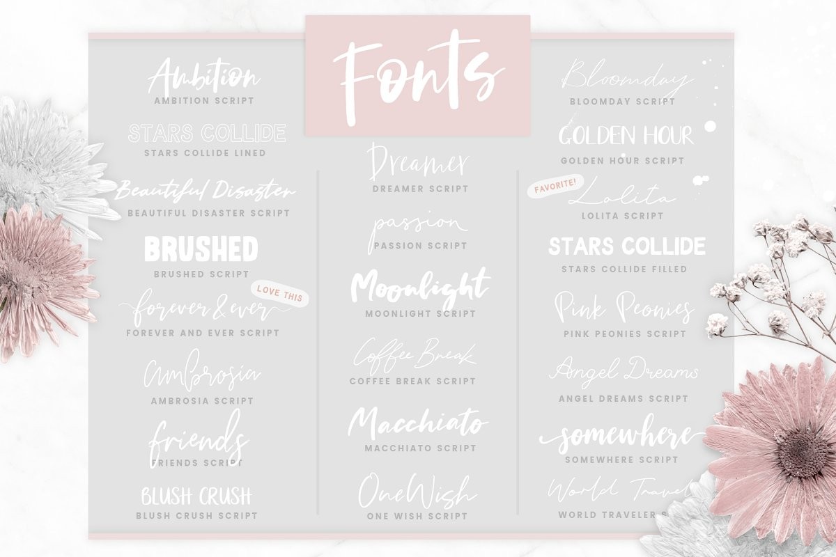 Made for the creative spirits out there, you’ll find a super selection of fonts for stylish projects including popular brush scripts, delicate handwriting and dreamy styles for typography lovers.