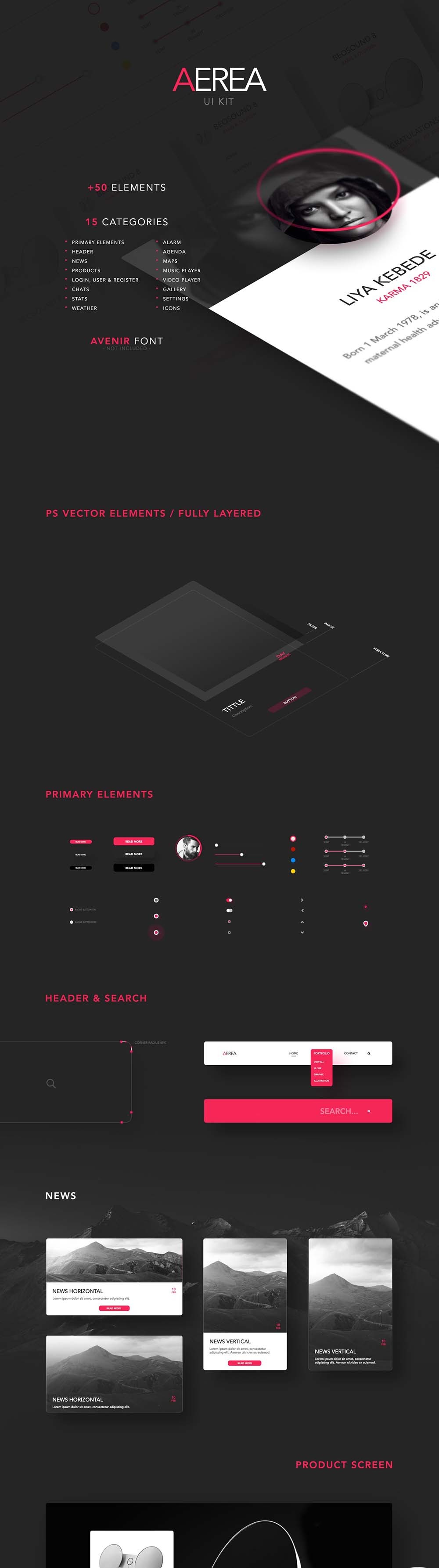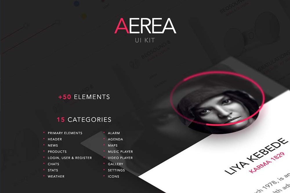 The Aerea UI kit is the optimal kit for your next project. With 50+ elements, in 15 different categories, this kit will boost your design workflow and create a wide variety of user experiences. Compatible with Photoshop, the kit comes in clean and organized PSD layers, and consists of purely vector elements. Some of the categories include news, weather, stats, and a music player.
