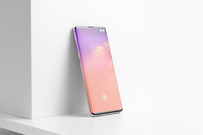 Customizable and easy to use Samsung Galaxy s10+ smartphone mockup, removable and editable floating widgets and changeable colors of all background elements.