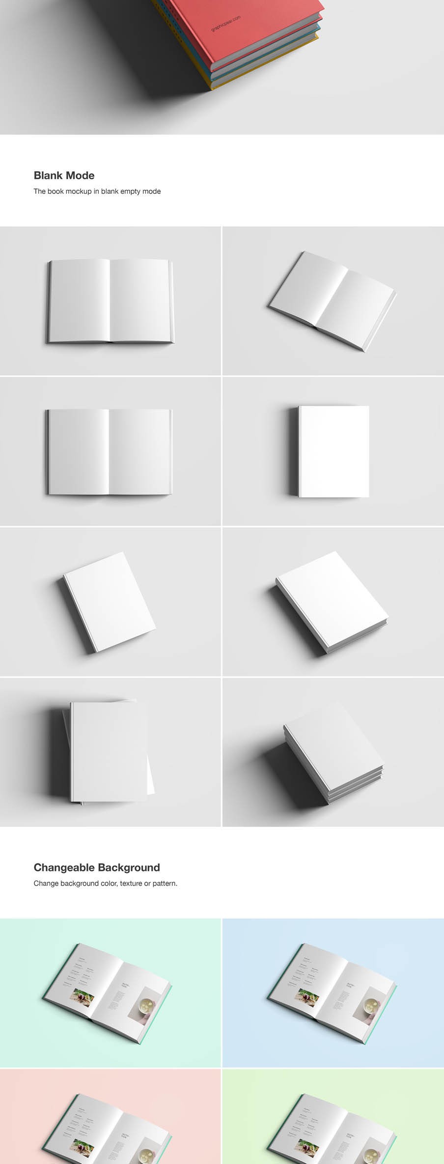 This unique and highly detailed book mockup is fully editable wth smart objects, lighting control, shadow control and more. This mockup is developed in high resolution 3000x2000px and is placed in well organized layers for your workflow convenience. Also included is a minimal Blank Mode, which is a blank and empty version of the mockup.