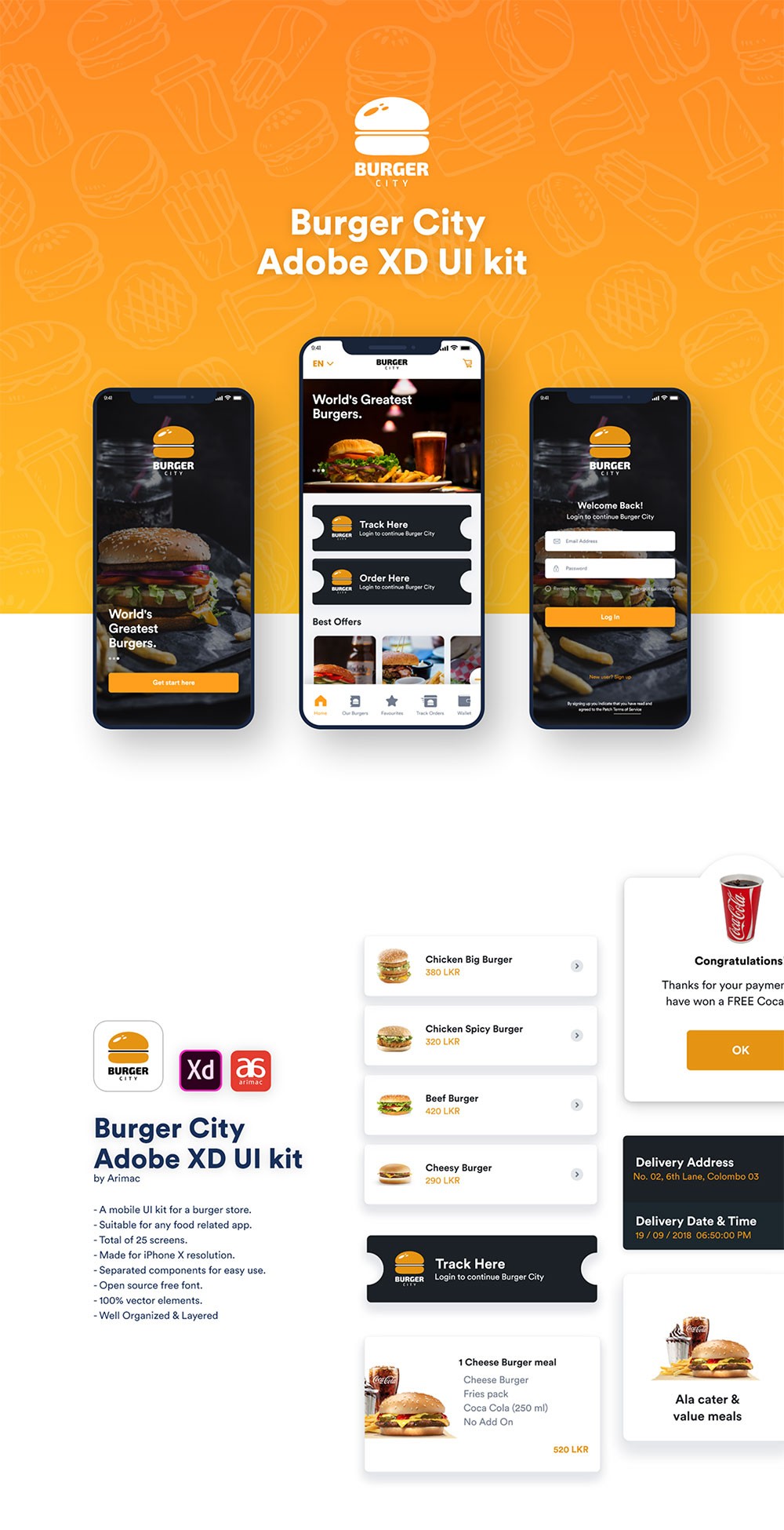 A mobile UI kit for a burger store. - Suitable for any food-related app. - Total of 25 screens. - Made for iPhone X resolution. - Separated components for easy use. - Open-source free font. - 100% vector elements. - Well Organized & Layered