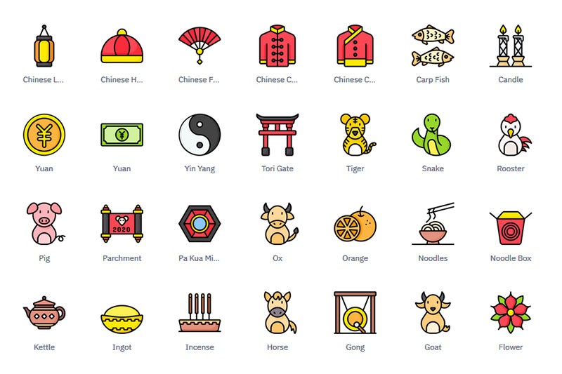 Icon collection of Chinese New Year in filled outline style.