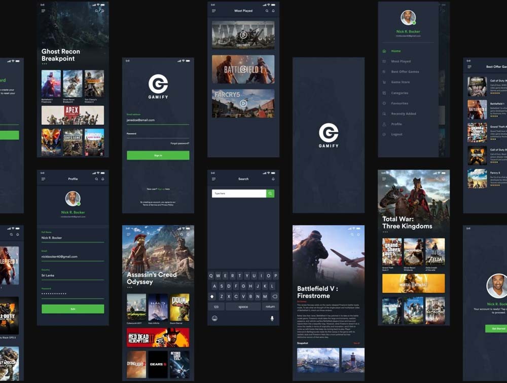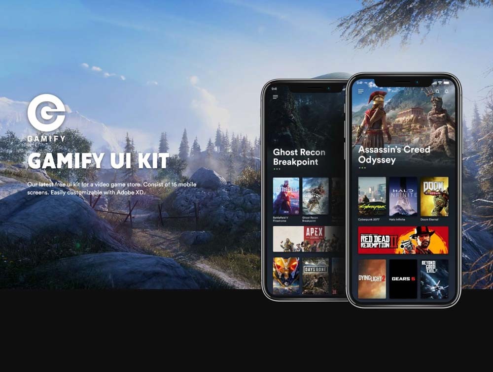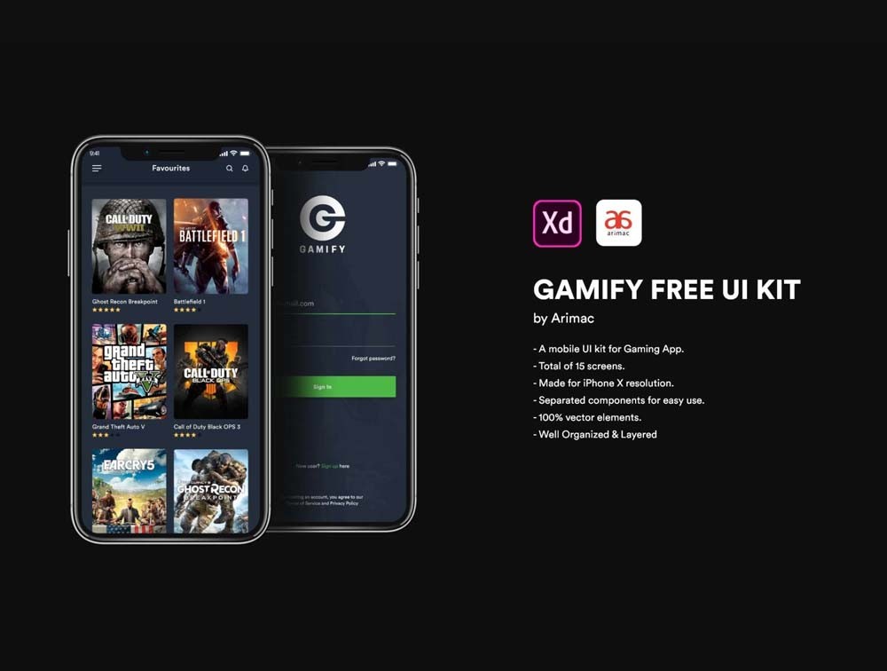 A mobile UI kit for Gaming App. - Total of 15 screens. - Made for iPhone X resolution. - Separated components for easy use. - 100% vector elements. - Well Organized & Layered