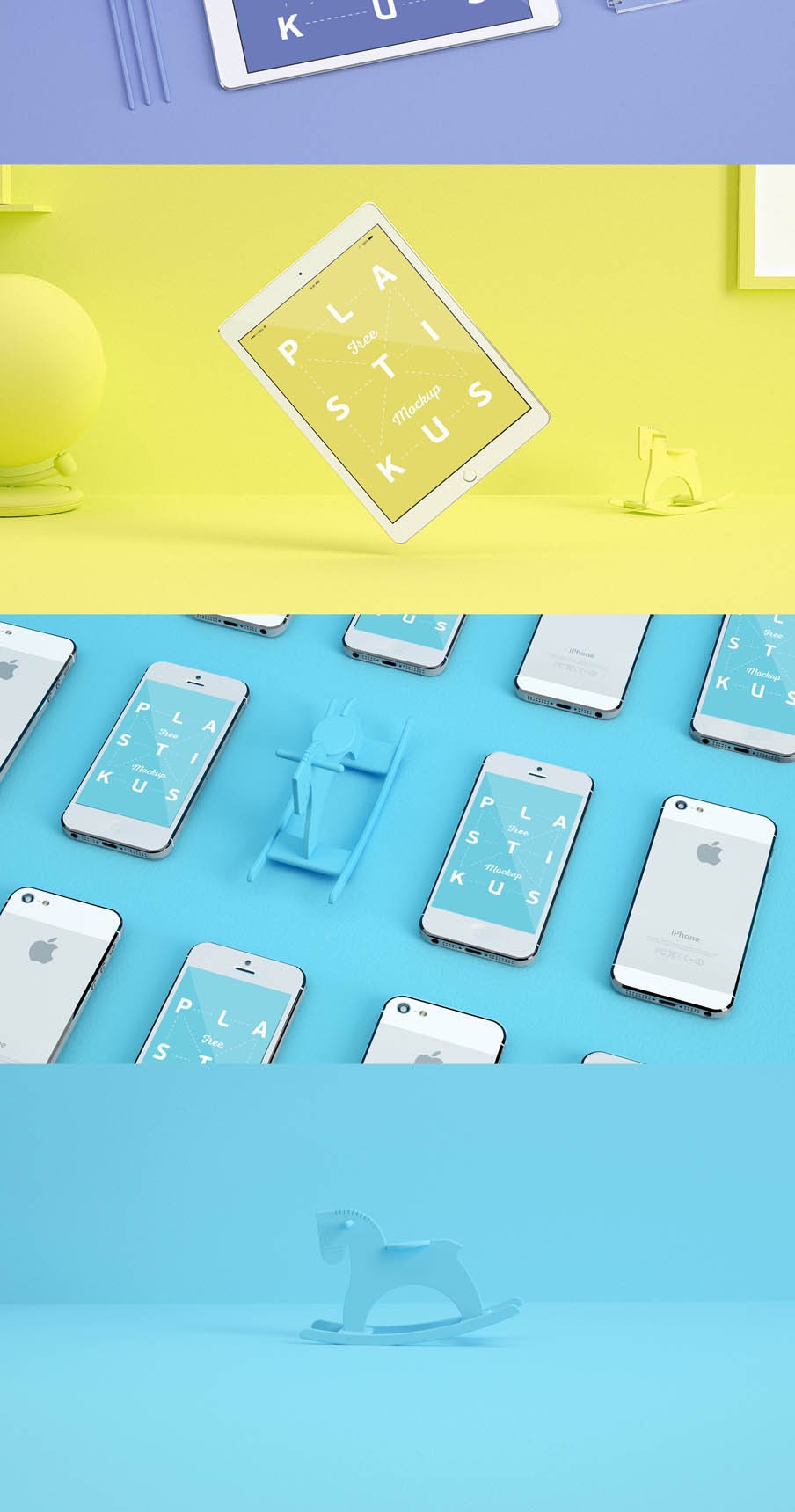 The Plastikus mockup includes scenes for mobile, desktop, and tablet devices. The smooth textures and bright color palette achieve a soothing yet effective presentation for your product. The mockup is made on a 3000x1687 canvas with changeable background color, editable smart objects, and 7 unique scenes.