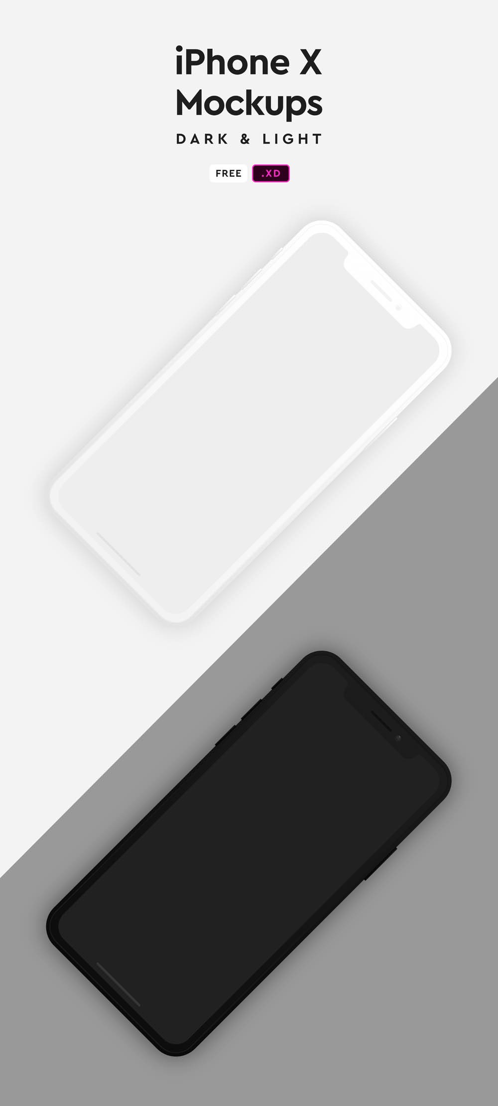 Showcase your work and save time with these minimal iPhone X mockups made from the ground up for Adobe XD. This file contains a fully editable iPhone X, status bar symbol, and home bar symbol, all in a dark and light theme. Enjoy!