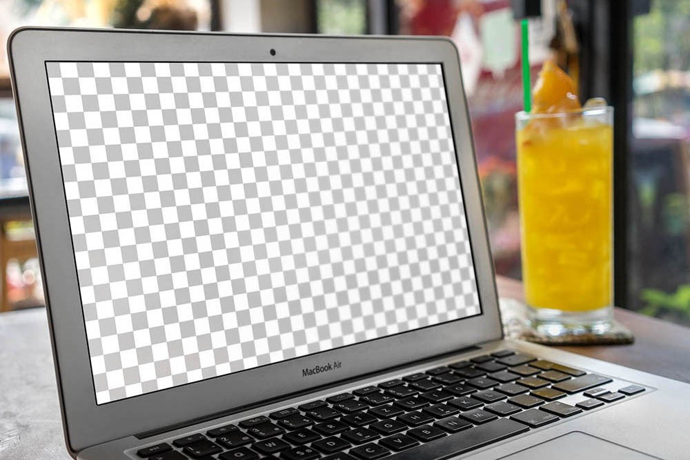 A beautiful high-res customizable mockup of the Macbook Air in a pretty hipster coffee shop.