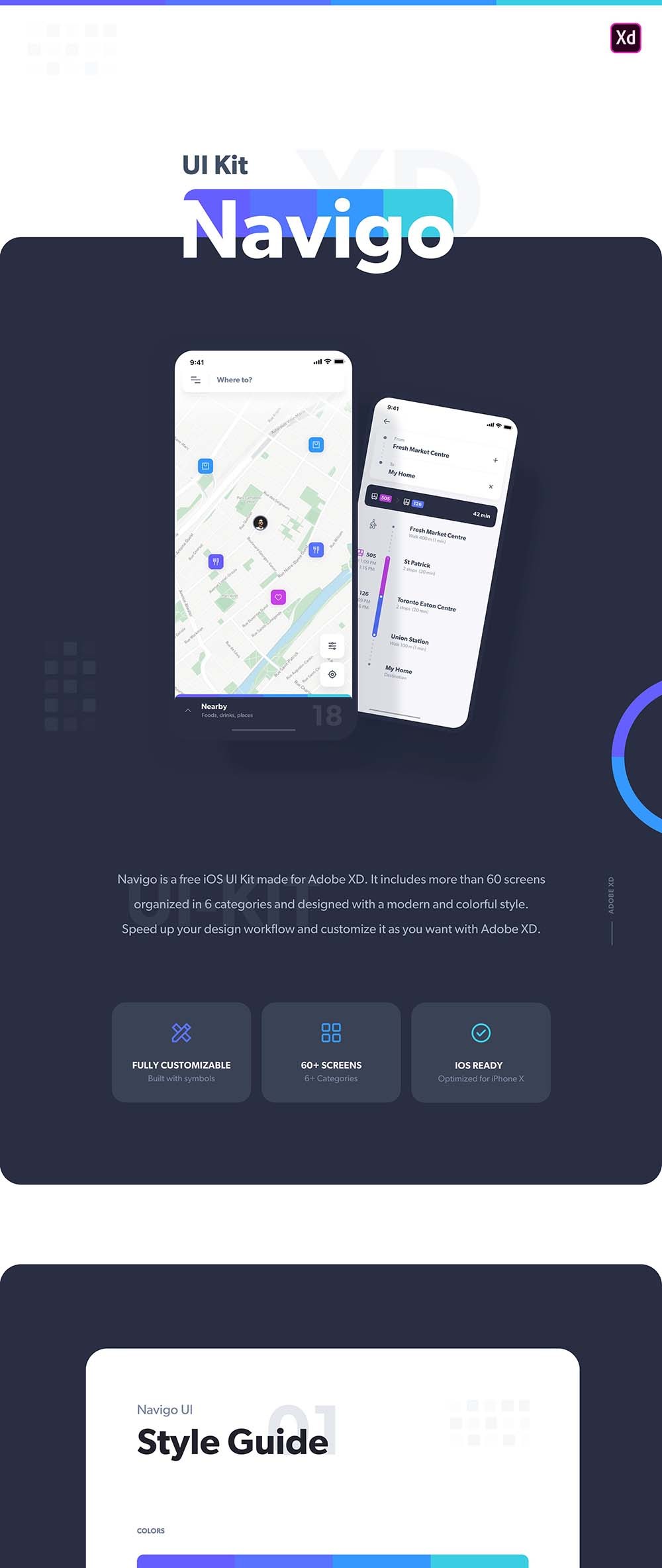 Navigo is a free iOS UI Kit made for Adobe XD. It includes 60 screens organized in 6 categories and designed with a modern and colorful style. Speed up your design workflow and customize it as you want in XD. This kit is completely customizable and is also optimized for iPhone X.
