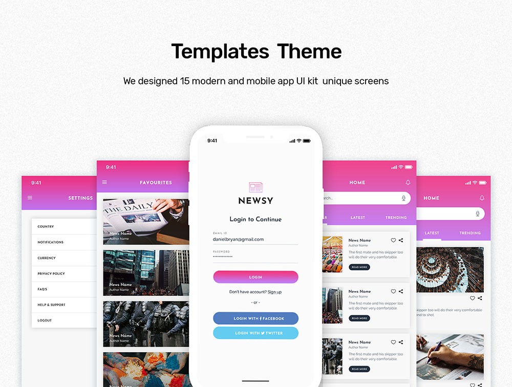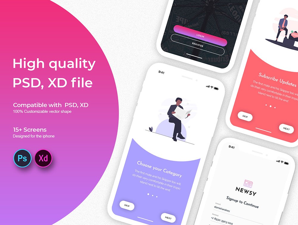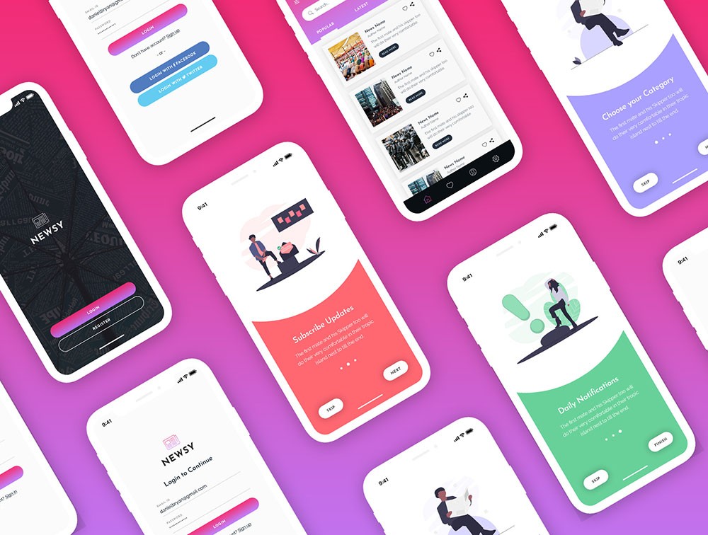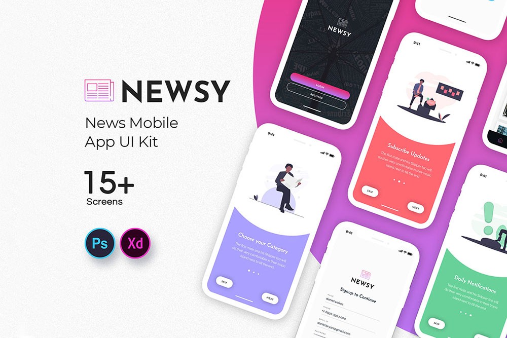 Newsy News Mobile App UI Kit includes more than 15 unique screens with 50+ sections. App UI kit for mobile app developers and News apps. As all the objects are created using shapes. This kit would be a great match for your News Applications!