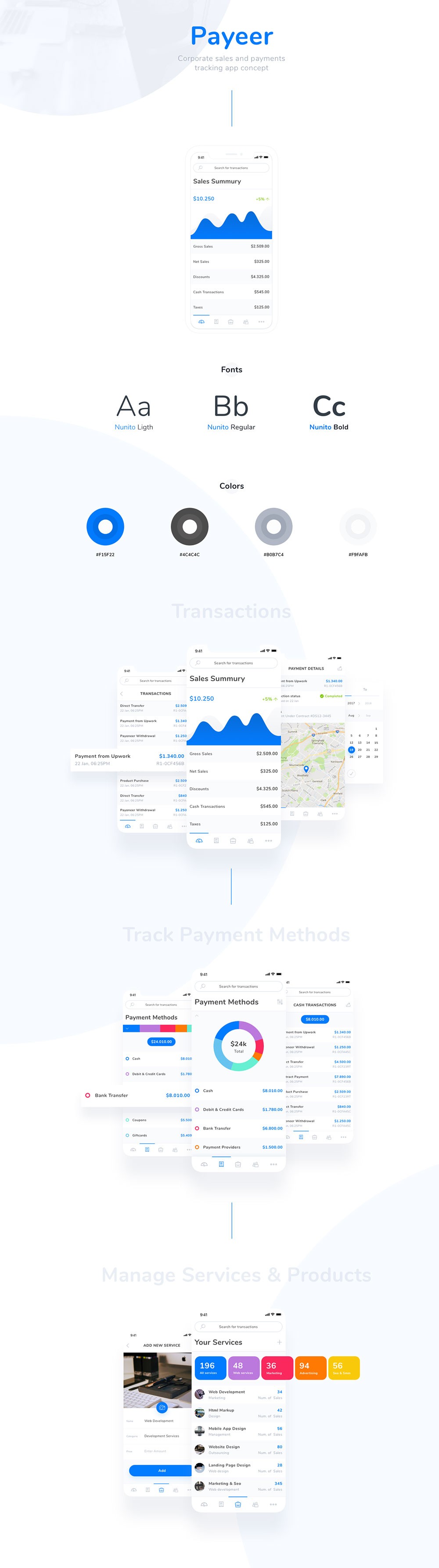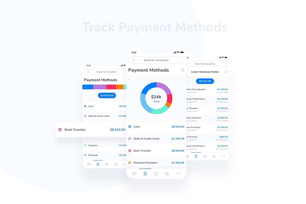 A set of 15 screens designed for your needs. Explore your personal or business transactions. Track employees income and outcome spendings. Check beautiful graphs render from available data.