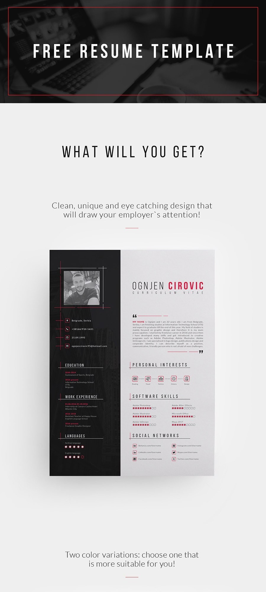 Free Professional Resume Template is ideal for your future job applications: it will draw your employer`s attention immediately! These A4 size templates are both creative and unique and they come in two color variations: choose one that you prefer more. This template contains 2 RGB files, 2 CMYK Print Ready files, fully editable and layered documents.
