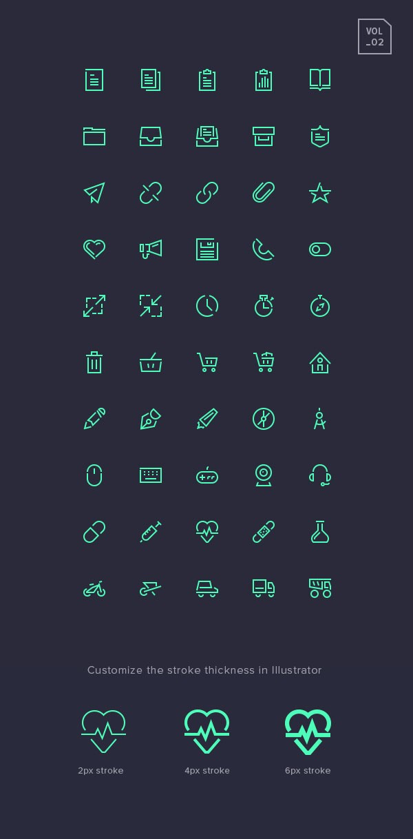 Here’s the second volume of the Stroke Gap Icons designed by Vlad Cristea. The set includes 50 icons great for your web and mobile projects. The AI file comes with editable strokes so you can easily adjust the thickness of each icon.