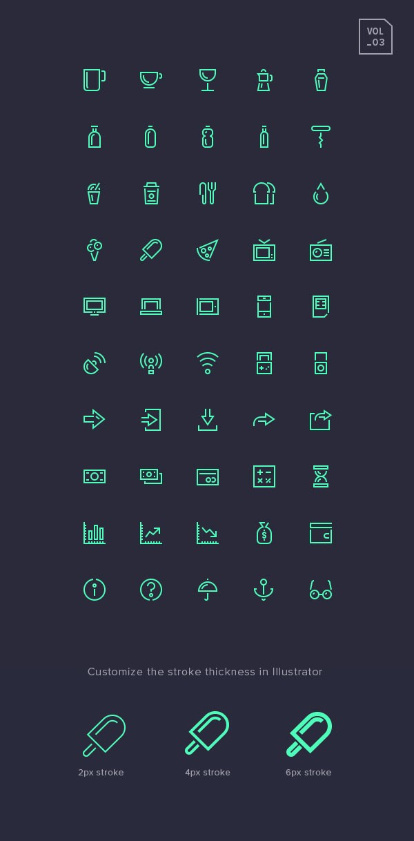 I’m happy to introduce the third volume of the Stroke Gap Icons set, 50 more beautiful icons to use in your projects. Just like with the previous volumes this one includes both PSD and AI files to easily customize the thickness of the strokes.