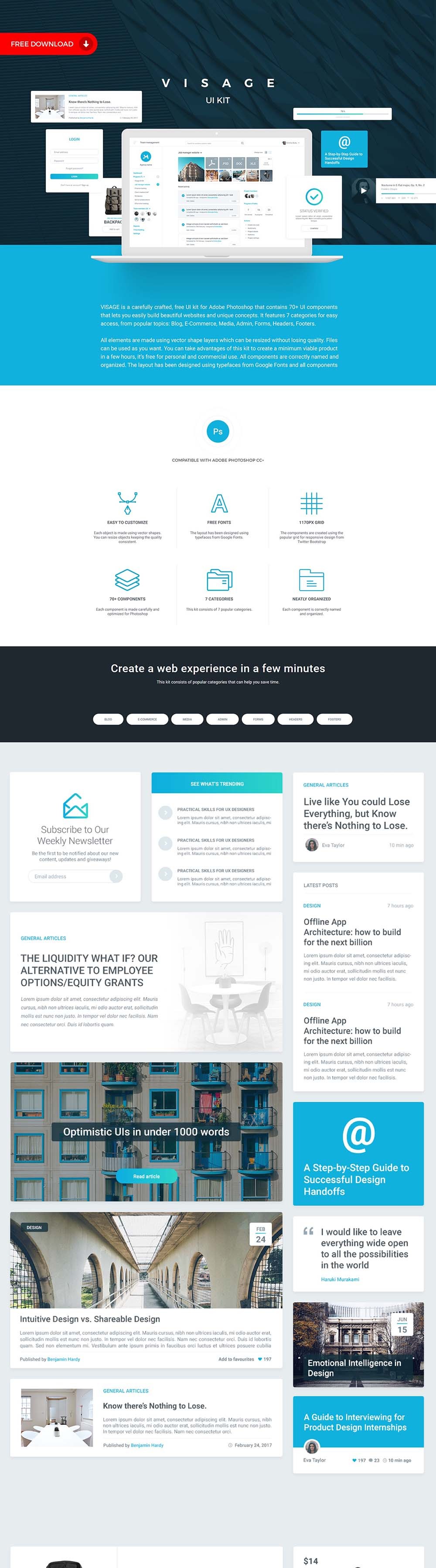 Visage is a pixel-perfect UI kit that contains 70+ UI components that allow you to create elegant websites and unique concepts. It features 7 categories for easy access, from popular topics: Blog, E-commerce, Media, Admins, Forms, Headers, Footers. All elements are fully vectorized and are easily editable while maintaining quality. With the design flexibility of this kit, it is ideal for both personal and commercial use.