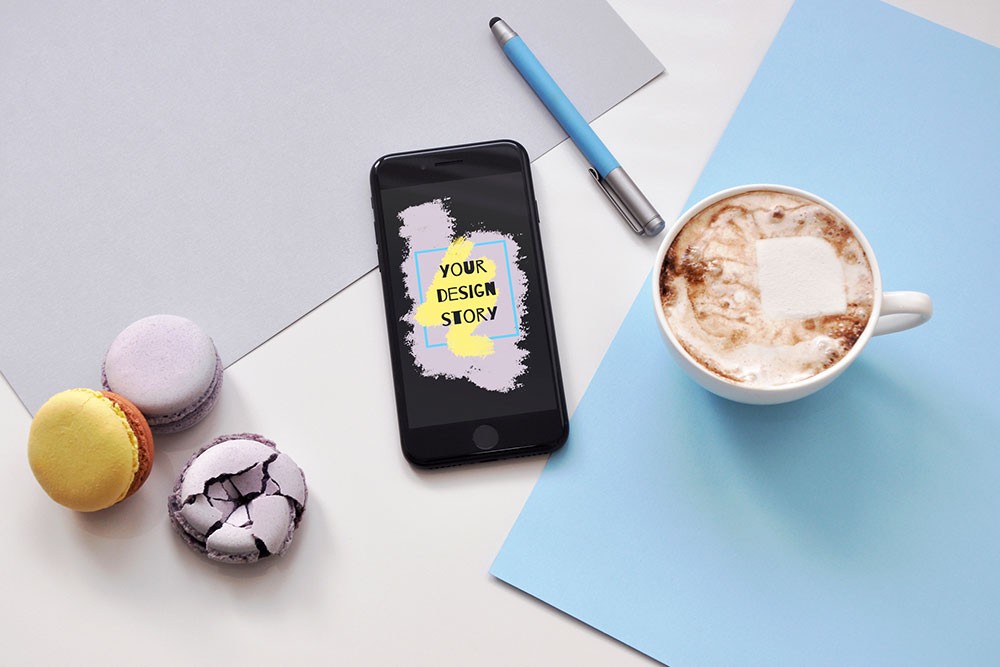 A collection of seven photo-based mockups showing the iPhone SE. Each PSD file measures 4288 x 2848 px at 300 dpi and is equipped with a smart layer for changing the display content.