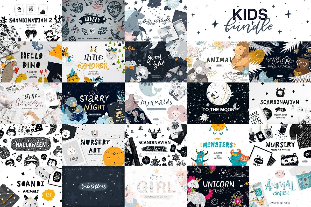 This Kids Bundle is packed with over 2850 graphic elements from 22 graphic packs. Cute animals, flowers, characters, magical elements, prints, lettering, patterns, printable art and more kids goods!