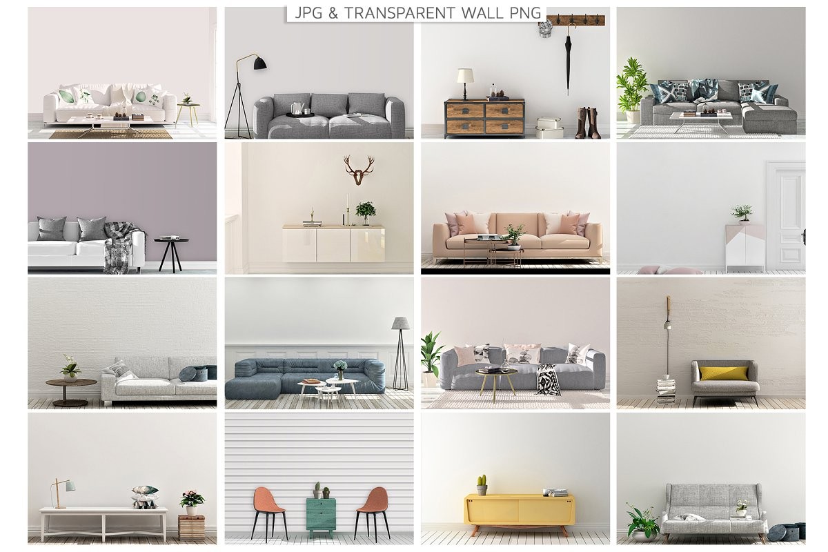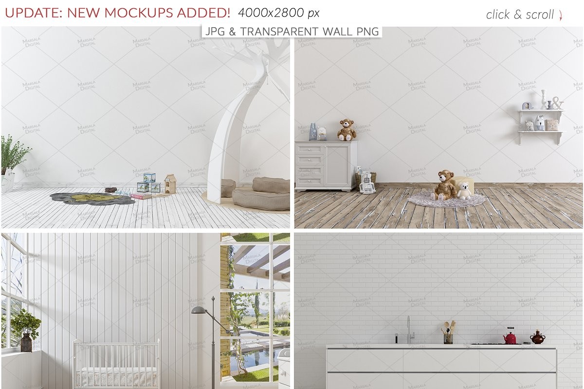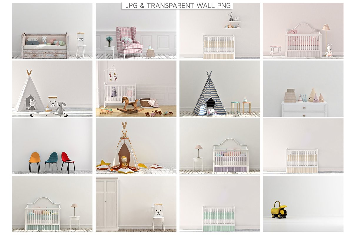 You will have a massive library for your presentation needs. Kids room, interior wall, kitchen, bedroom, bathroom even gym scenes!