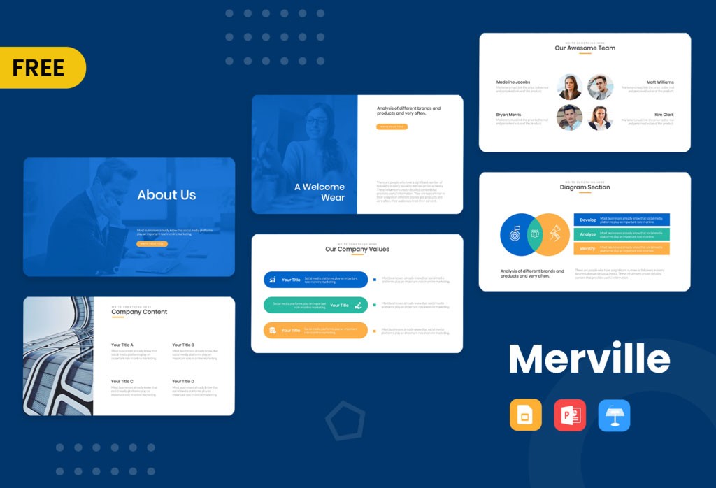 Merville Free Presentation Template is a theme that was designed with the features you are going to need to present in a formal and captivating way. In its slides, you are going to find text boxes that were designed in such a way that you can present your concepts or vital points in an easy-to-understand format. To use its text boxes, only click on the ones you want to use and copy-and-paste your information. Besides looking clean, your slides will portray professionalism.