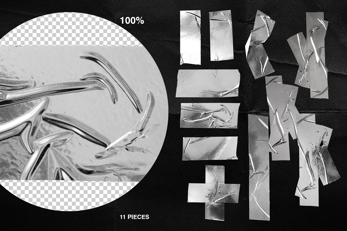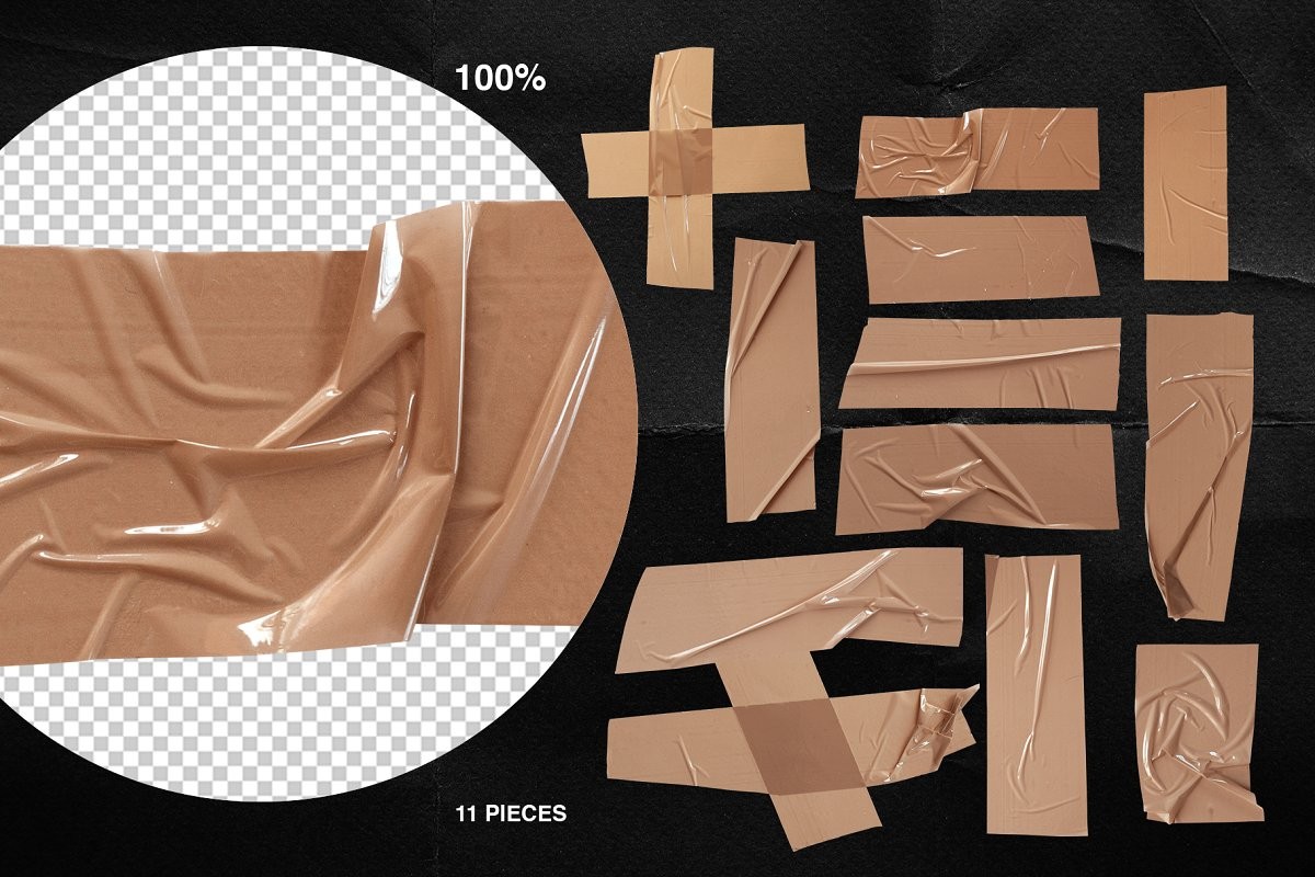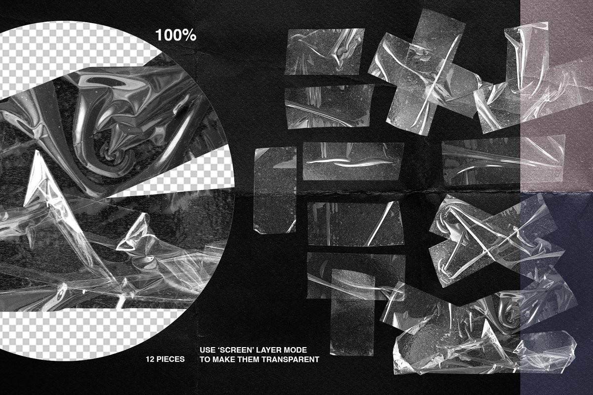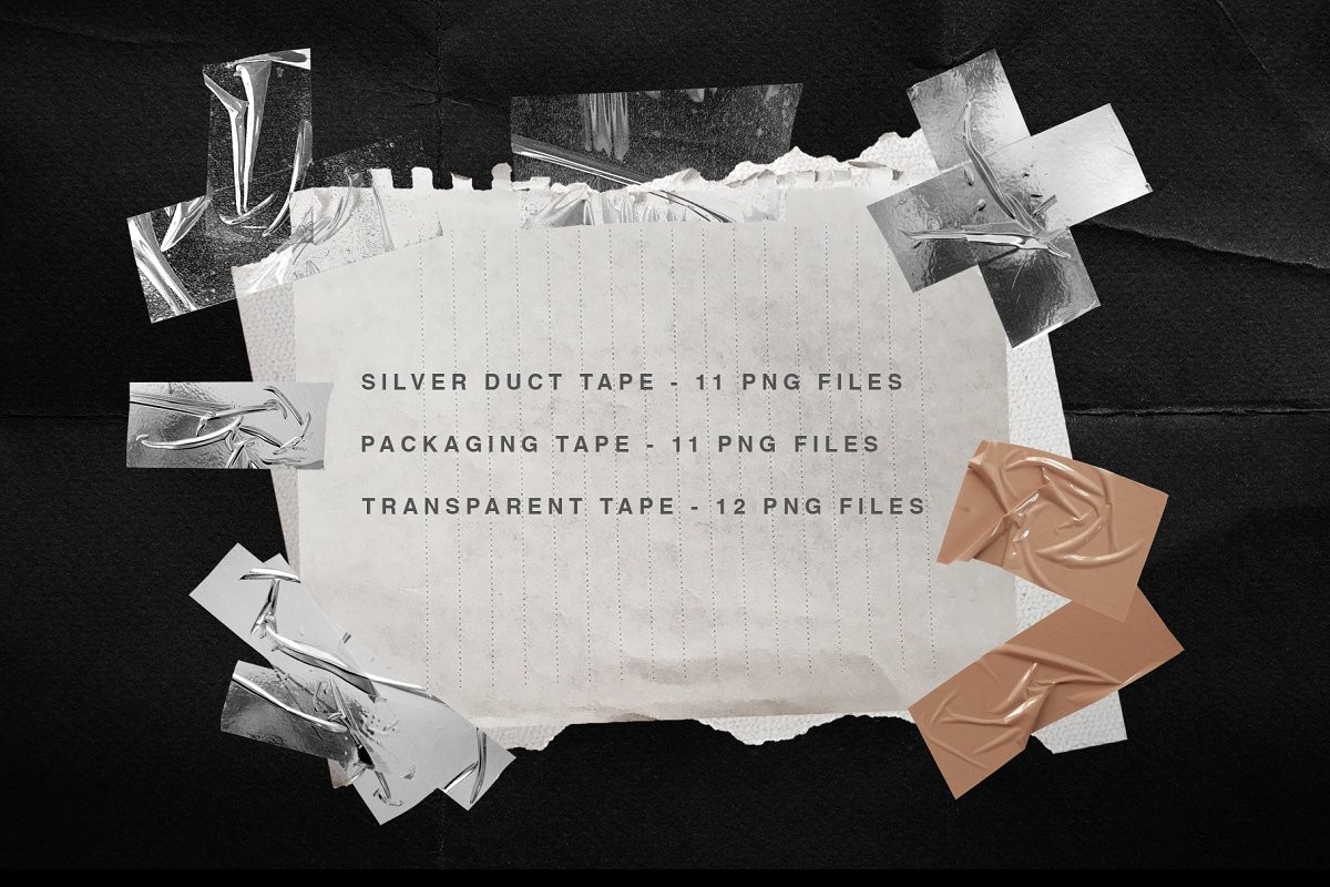 Awesome collection of the trendiest items: plastic wrap textures, duct tape pieces, torn paper sheets, stickers, holographic textures and logos. That's what you need for your brand to stand out!