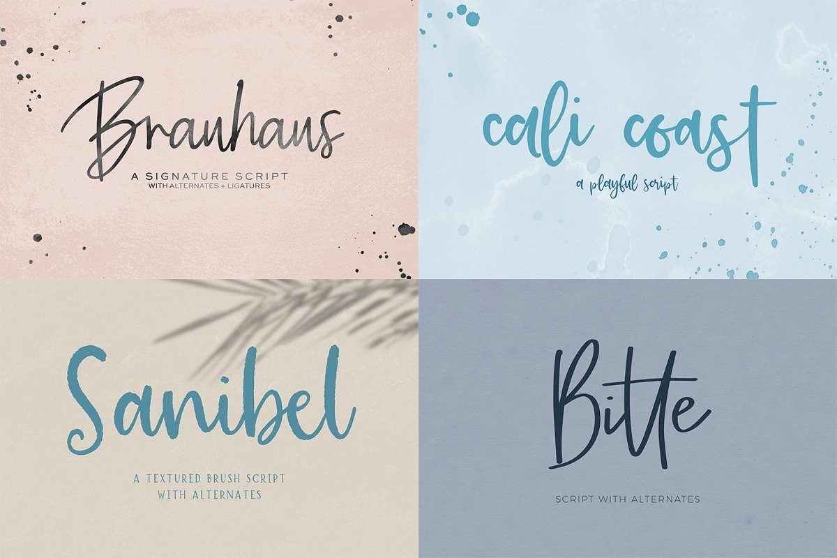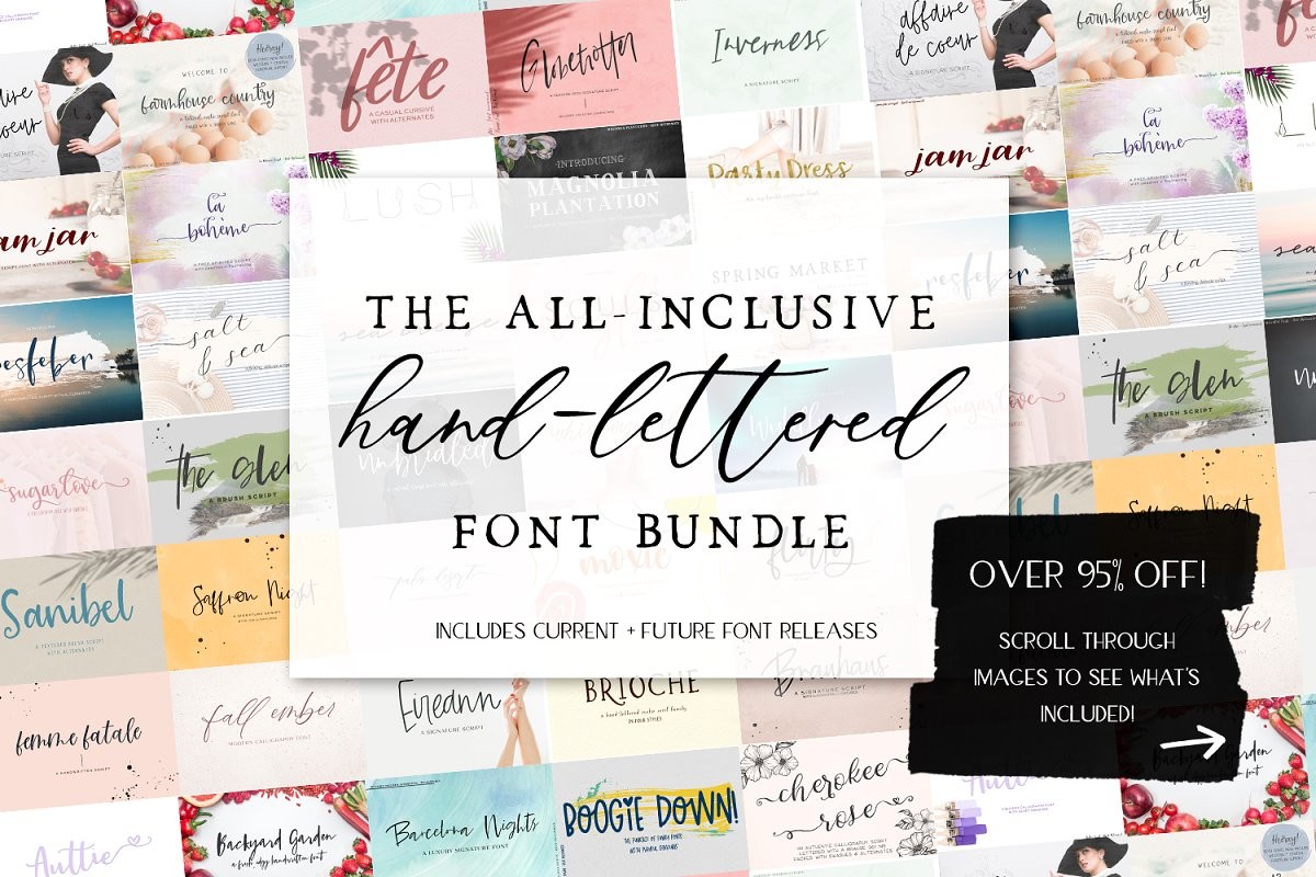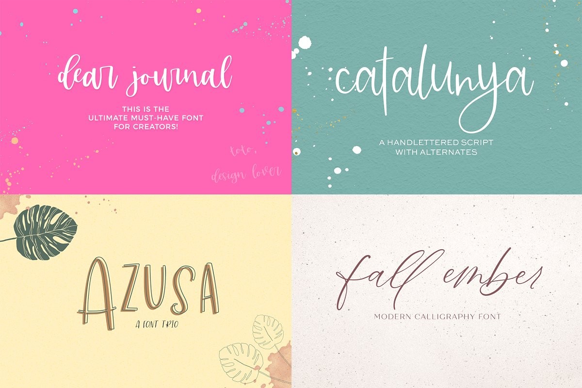 The variety is astounding: script fonts, serif fonts, sans fonts, calligraphy fonts, crafting fonts, signature fonts, and rustic fonts are included in this bundle, making it incredibly versatile. It's a powerhouse addition to any designer's font arsenal! I'm a little nuts about alternates + ligatures, so many of these fonts include a ton of extras, making them even more diverse + useful!