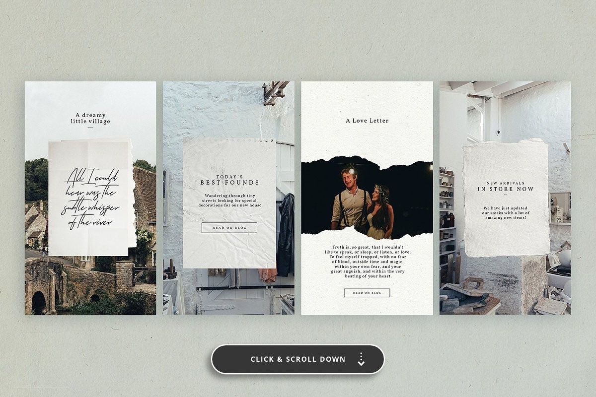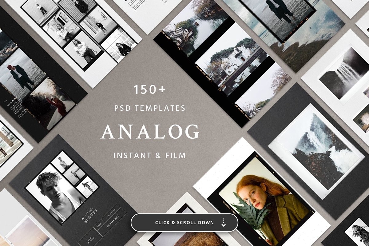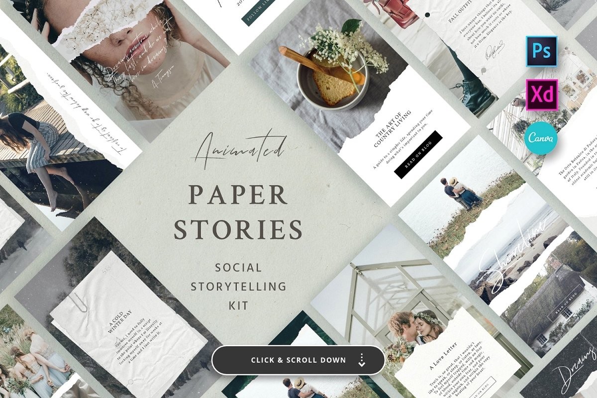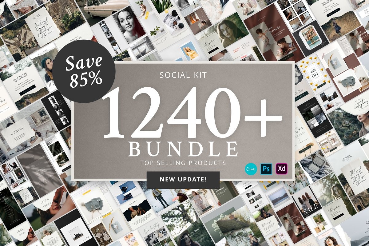 The Social Kit Bundle contains all our top selling products, including the popular Analog Kit and the best seller Animated Paper Stories, certified by Creative Market. The package features a total of 1180 layouts for an overall value of $238.
