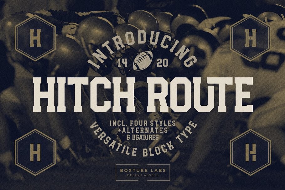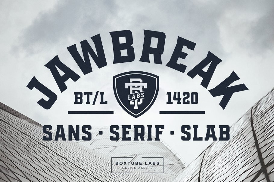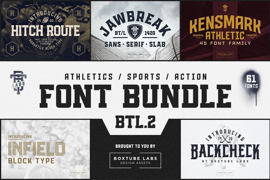 BoxTube Labs presents the Sports Font Bundle BTL.2 - a collection of five sporty and athletic type families with a total of 61 unique fonts. This bundle features strong, confident and powerful typefaces designed to work great with sports logos, club branding, apparel applications, labels and more, including our top sellers Jawbreak and Hitch Route.