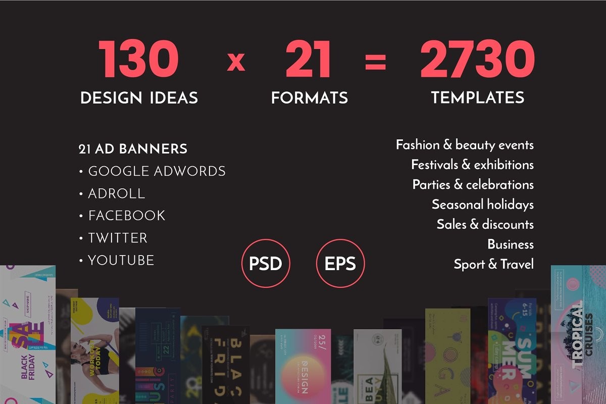 Made with attention to details, the banners follow the latest design trends and are optimized for different social networks like Facebook, Twitter, YouTube, Google Adwords, Adroll.
